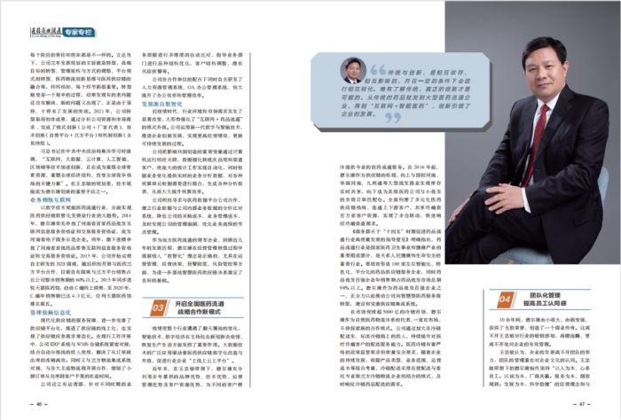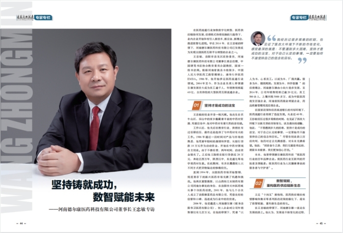 2022年10月31日,中国医药业《医药商业流通》推出了十月份期刊,内容刊发了河南德尔康医药科技有限公司董事长王忠敏专访——«坚持铸就成功,数智赋能未来»。