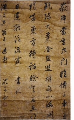 《行书诗轴》,纵66厘米,横33厘米,绢本。此轴是为祝寿之作,上书寿词一阙。这种寿词在明清时期颇为流行,韵味高雅而又神秘。其词曰:“岳降当重九门临,仙子车至,瓯陈大枣金碗进。胡麻如海开樽盛,东方待诏赊,登高在明日,还拟泛流霞。”从书法上讲,此书风格萧散自然,古雅平和;墨色秀润,意境清瞻而幽远;用笔转折,收放自如,娴熟而婉媚,有挺拔飞扬之态。在结体上,此书讲求精微,紧密而有势,字体向右上微倾斜,形成一种疏宕秀逸的特色。在笔墨上,此幅用笔精到,始终保持正锋,少用偃滞之笔。用墨上也很讲究,枯湿浓淡,尽处其妙。在章法上,字与字,行与行之间,分行布局,疏朗匀称,力追古法。一看就知是是继承了晋、唐、宋、元各家书风,尤其是董其昌影响很深,如清风飘拂,微云卷舒,颇得天然之趣。落款为“书祝汉三年兄五十荣寿,沈宗敬。”下钤“沈宗敬印”白文印。