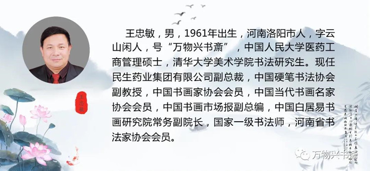 “万物兴书斋”是王忠敏先生书法自媒体官方平台,平台所有作品均为王忠敏先生创作,王忠敏先生创作风格古意盎然,意趣苍茫。书法造诣颇深,作品笔致流畅,风流儒雅,诸体皆擅。欢迎书法爱好者关注交流。