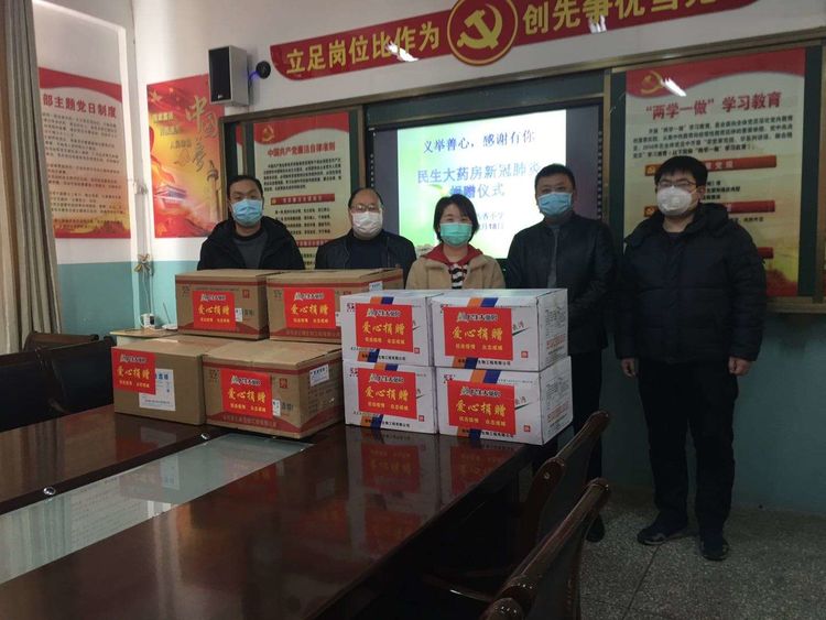 民生大药房惠民店向延秋村委会爱心捐赠应急防疫物资。